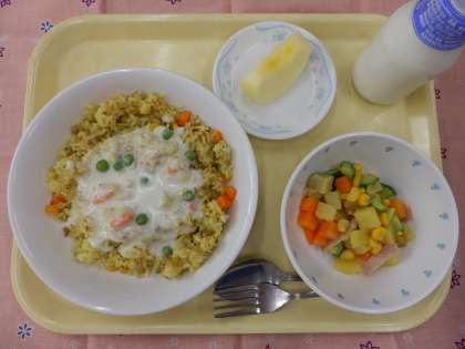 今日の献立は、カレーピラフホワイトソース、さつまいものサラダ、りんご、牛乳でした。