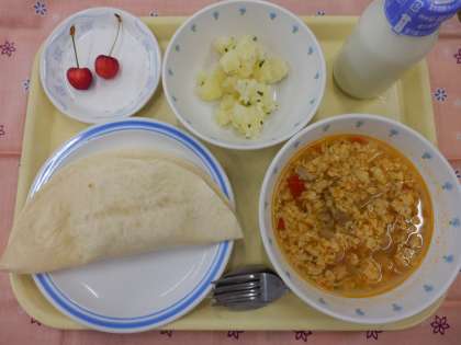 今日の献立は、タコス、ソパ・デ・アホ、パセリポテト、さくらんぼ、牛乳でした。