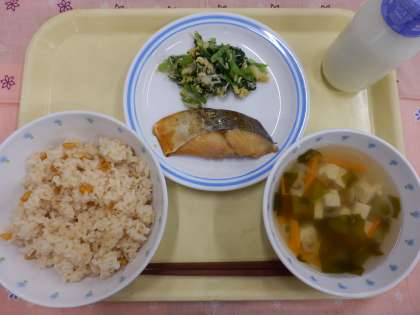 今日の献立は、焼きとうもろこしご飯、魚の照り焼き、青菜のポン酢和え、すまし汁、牛乳でした。