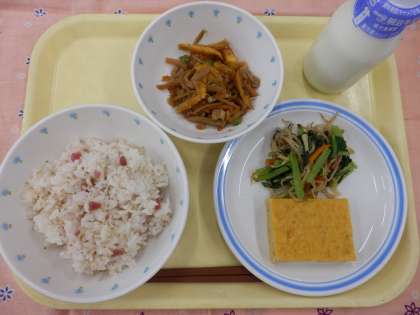 今日の献立は、カリカリ梅ご飯、千草焼き、野菜のおかか和え、じゃがいものきんぴら、牛乳でした。