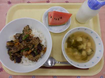 今日の献立は、麻婆なす丼、わかめスープ、小玉すいか、牛乳でした。