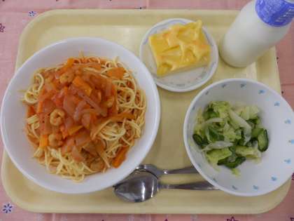 今日の献立は、スパゲッティ海の幸ソース、グリーンサラダ、パイナップルケーキ、牛乳でした。