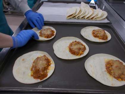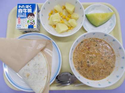 今日は、世界の料理〜メキシコ編〜です。タコスは、トルティーヤ(トウモロコシの粉から作った生地)に、肉や野菜、ソースなどをのせて食べる料理です。今日は、手作りのメキシカンソースとピザチーズをのせて焼き、半分に折りました。