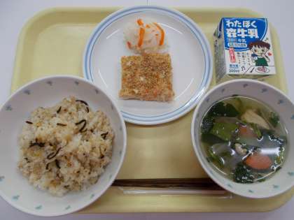 今年最初の給食は縁起ものである昆布を混ぜ込んだご飯、おせち料理の松風焼きと紅白なます、7日の人日の節句にちなんだ七草汁を作りました。
