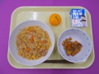 <献立>☆北海みそラーメン☆大豆とさつまいもの甘辛煮☆みかん☆牛乳<食材の産地>...