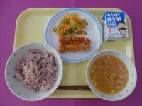 <献立>☆ご飯☆鮭のもみじ焼き☆塩昆布あえ☆豆腐とわかめのみそ汁☆牛乳<食材の産...