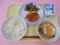 <献立>☆ご飯☆春キャベツのメンチカツ☆大根とひじきのサラダ☆みそ汁☆牛乳ひき肉...