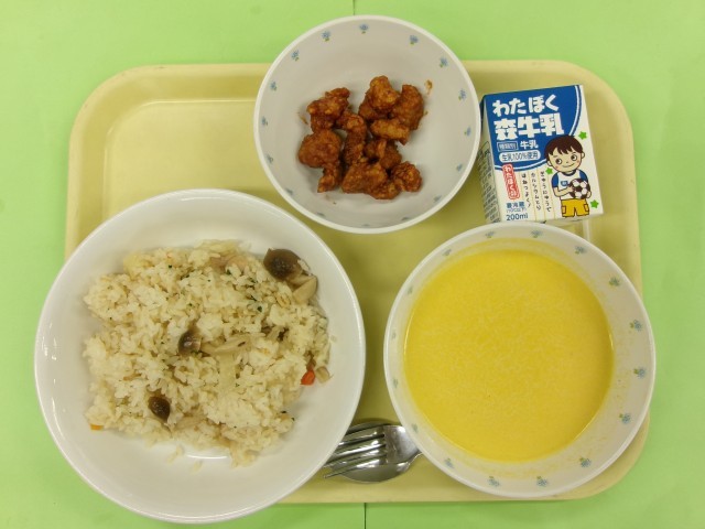 9月29日(月)の給食 公開日 2025/09/29 更新日 2025/09/29 給食 【献立】きのこピラフ、白身魚のマリアナソースがけ、人参ポタージュ、牛乳【主な食材産地】にんにく(青森)、たまねぎ・にんじん(北海道)、えりんぎ・しめじ(長野)、えのき(新潟)、パセリ(茨城)、しょうが(高知)、鶏肉(静岡)、もうか(宮城)、米(秋田)