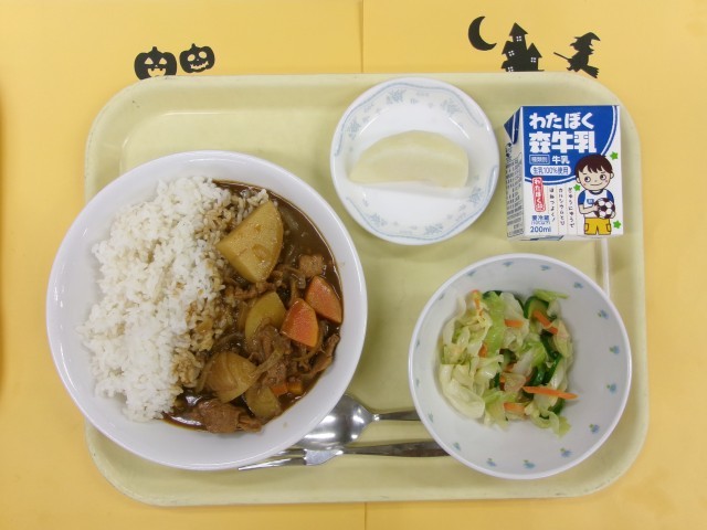 10月16日(木)の給食 公開日 2025/10/21 更新日 2025/10/20 給食 【献立】カレーライス、フレンチサラダ、りんご、牛乳【主な食材産地】豚肉(鹿児島)、しょうが(高知)、にんにく(青森)、たまねぎ・にんじん・じゃがいも(北海道)、きゃべつ(群馬)、きゅうり・りんご(長野)、米(秋田)