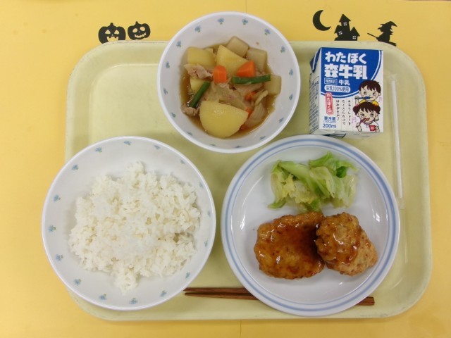 10月21日(火)の給食 公開日 2025/10/22 更新日 2025/10/21 給食 【献立】ご飯、豆腐の真砂揚げ、きゃべつの即席漬け、肉じゃが、牛乳【主な食材産地】鶏肉(宮崎)、豚肉(岩手)、にんじん・たまねぎ・じゃがいも(北海道)、ねぎ・鶏卵(青森)、きゃべつ(長野)、しょうが(高知)、いんげん(千葉)、えび(インド)、ちりめんじゃこ(広島)