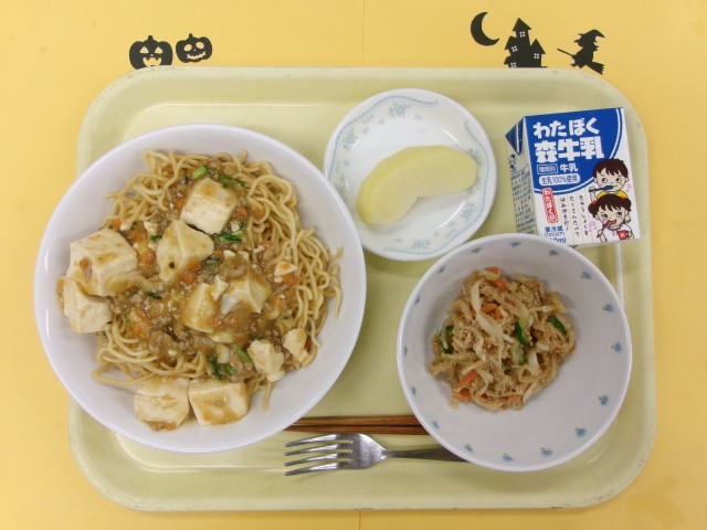 10月22日(水)の給食 公開日 2025/10/24 更新日 2025/10/24 給食 【献立】麻婆焼きそば、切干大根のシャキシャキサラダ、りんご、牛乳【主な食材産地】豚肉(群馬)、りんご(岩手)、しょうが(高知)、にんにく・ねぎ(青森)、にんじん・玉ねぎ・大根(北海道)、にら(茨城)