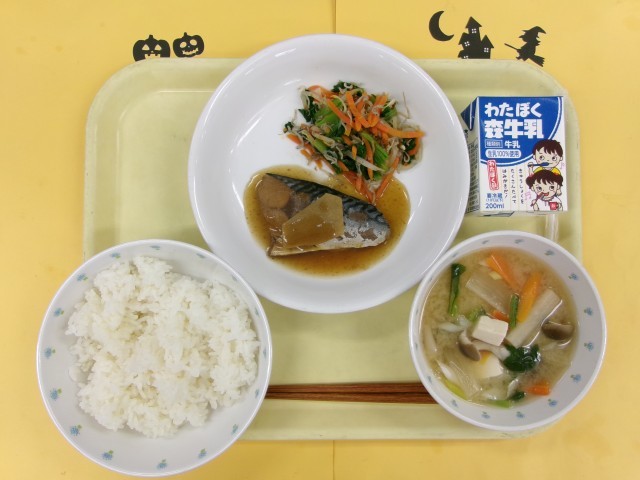ご飯、鯖のソース煮、じゃこ入り野菜の土佐あえ、ごま味噌汁、牛乳