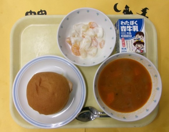 照り焼きチキンサンド、トマトクリームスープ、フルーツヨーグルト、牛乳