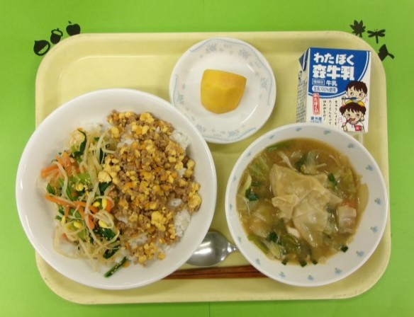 11月5日(水)の給食 公開日 2025/11/07 更新日 2025/11/06 給食 【献立】ビビンパ、味噌わんたんスープ、かき、牛乳【主な食材産地】豚肉(岩手)、しょうが(高知)、だいこん(千葉)、大豆もやし(栃木)、にんじん・玉ねぎ(北海道)、きゃべつ(千葉)、えのき(長野)、にら・小松菜(茨城)、かき(愛知)、鶏卵(青森)、米(秋田)