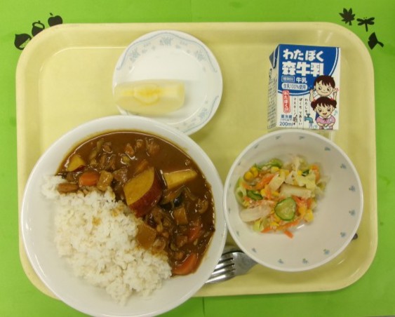 11月21日(金)の給食 公開日 2025/11/26 更新日 2025/11/26 給食 【献立】秋野菜カレーライス、ツナサラダ、りんご、牛乳【主な食材産地】にんにく(青森)、しょうが・なす(高知)、玉ねぎ(北海道)、にんじん・さつまいも(千葉)、しめじ(長野)、きゅうり(群馬)、きゃべつ(愛知)、鶏肉(宮崎)、りんご・米(秋田)