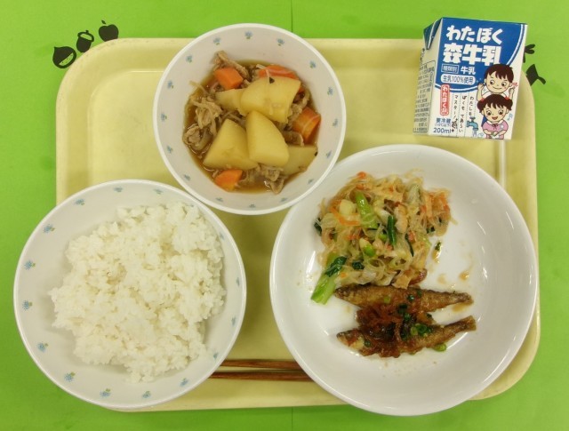 ご飯、チカの南蛮漬け、千草あえ、肉じゃが、牛乳