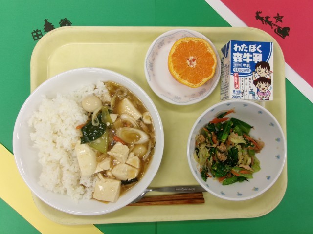 12月2日(火)の給食 公開日 2025/12/04 更新日 2025/12/03 給食 【献立】ご飯、豆腐の五目炒め、こまツナ春雨サラダ、菊花みかん、牛乳【主な食材産地】にんにく・にんじん(青森)、生姜(高知)、青梗菜(埼玉)、ねぎ・小松菜(茨城)、きゃべつ(愛知)、鶏肉(宮崎)、うずらの卵(愛知)、みかん(愛媛)、米(秋田)