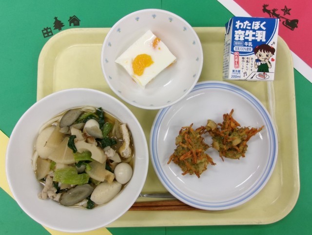 けんちんうどん、有機にんじんの磯かき揚げ、みかん牛乳寒、牛乳