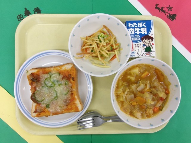 12月12日(金)の給食 公開日 2025/12/15 更新日 2025/12/12 給食 【献立】ピザトースト、サウピカンサラダ、彩り野菜のコロコロスープ、牛乳【主な食材産地】にんにく(青森)、ピーマン(茨城)、きゃべつ(群馬)、きゅうり(宮崎)、にんじん・大根(千葉)、セロリ(静岡)、カボチャ(鹿児島)、鶏肉(静岡)、玉ねぎ・じゃがいも(北海道)