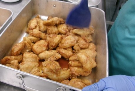 12月19日(金)給食室のヒトコマ 公開日 2025/12/22 更新日 2025/12/19 給食 チキン南蛮は、揚げた鶏肉に甘酢ダレをよく絡めています。この後、教室に運ばれるまでの間もタレが染みていくようにしていました。よくなじんだところがタルタルソースやご飯と合いますね。