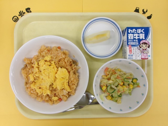 オムチキライス、ごまドレッシングサラダ、りんご、牛乳