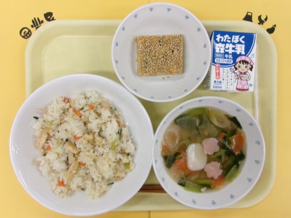 七草ごはん、松風焼き、トック雑煮、牛乳