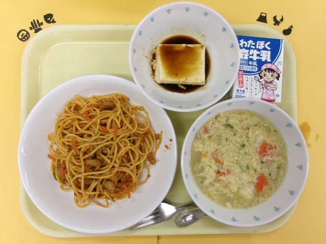 1月13日(火)の給食 公開日 2026/01/13 更新日 2026/01/13 給食 【献立】スパゲティーナポリタン、ふわふわ卵スープ、黒蜜パンナコッタ、牛乳【主な食材産地】にんにく・鶏卵(青森)、にんじん(千葉)、ピーマン(宮崎)、玉ねぎ(北海道)、パセリ(茨城)、豚肉(鹿児島)、鶏肉(静岡)