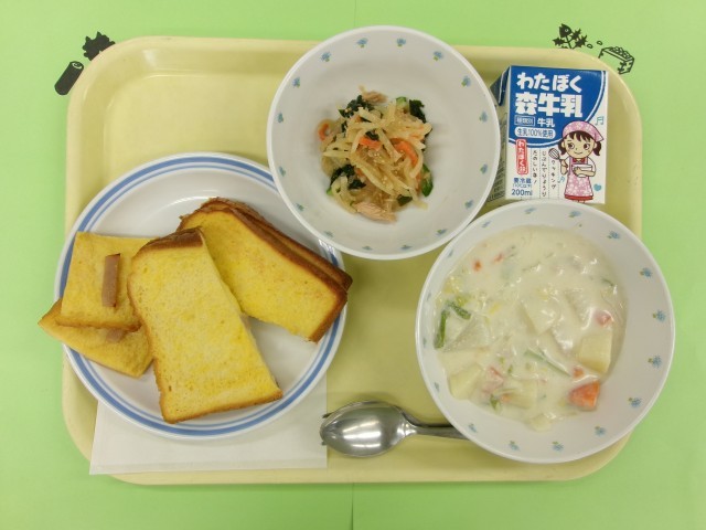 モンテクリストサンドイッチ、ツナと大根のサラダ、冬野菜クリームスープ、牛乳