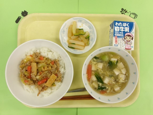 2月10日(火)の給食 公開日 2026/02/12 更新日 2026/02/12 給食 【献立】スタミナ丼、中華風野菜、たまご春雨スープ、牛乳【主な食材産地】豚肉(鹿児島)、玉ねぎ(北海道)、鶏卵・にんにく(青森)、にんじん(千葉)、もやし(栃木)、きゅうり(埼玉)、生姜(高知)、きゃべつ(群馬)、だいこん(神奈川)、米(秋田)