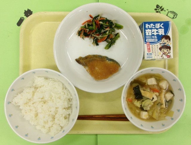 ご飯、ぶりの塩焼き おろし醤油がけ、野菜の海苔あえ、豆腐ときゃべつの味噌汁、牛乳