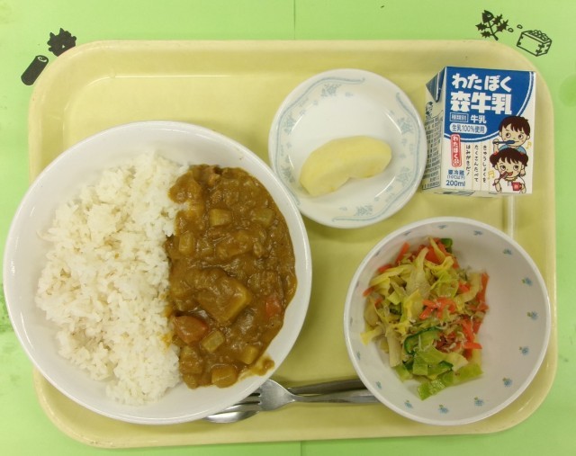とんとんカレーライス、きゃべつとじゃこのサラダ、りんご、牛乳