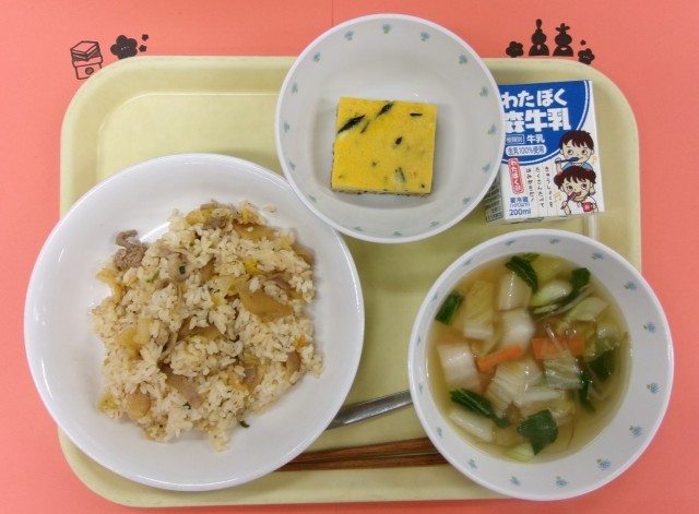 3月2日(月)の給食 公開日 2026/03/03 更新日 2026/03/02 給食 【献立】キムタクご飯、ひじき入り卵焼き、豆腐の中華スープ、牛乳【主な食材産地】豚肉(岩手)、鶏肉(宮崎)、鶏卵・にんにく(青森)、生姜(高知)、青梗菜・白菜(茨城)、にんじん(千葉)、こねぎ(福岡)、もやし(栃木)、米(北海道)