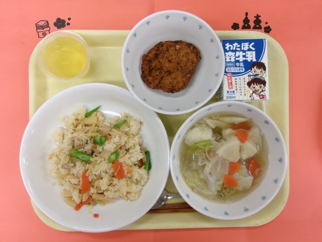 3月6日(金)の給食【郷土料理:青森県】 公開日 2026/03/09 更新日 2026/03/06 給食 【献立】※料理名に色がついているのが郷土料理です。ホタテと鶏のおこわ、イカメンチ、せんべい汁、りんごゼリー、牛乳【主な食材産地】 ねぎ・にんじん・大根(千葉)、生姜(高知)、いんげん(沖縄)、玉ねぎ(北海道)、きゃべつ(愛知)、