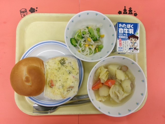 ミルクパン、チキングラタン、グリーンサラダ、ポトフ、牛乳