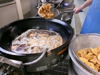 写真は、かつを揚げているところです。教室ではおかわりジャンケンが熱く開催されてい...