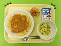 【献立】スパゲティーミートボールソース、グリーンサラダ、お豆のケーキ、牛乳【主な...