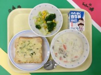 【献立】ツナポテトースト、ブロッコリーサラダ、白菜のクリーム煮、牛乳【主な食材産...