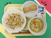 【献立】ピリ辛坦々ご飯、五目春巻き、中華風コーンスープ、牛乳【主な食材産地】にん...