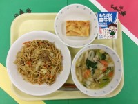 今日はインドネシア料理の給食です。【献立】ナシゴレン、サテ、ソトアヤム、牛乳【主...