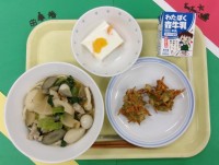 【献立】ご飯、豆腐の五目炒め、こまツナ春雨サラダ、菊花みかん、牛乳【主な食材産地...
