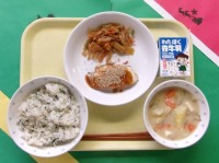【献立】ごはん、ひじきふりかけ、鯖の味噌あんかけ、磯香あえ、吉野汁、牛乳【主な食...