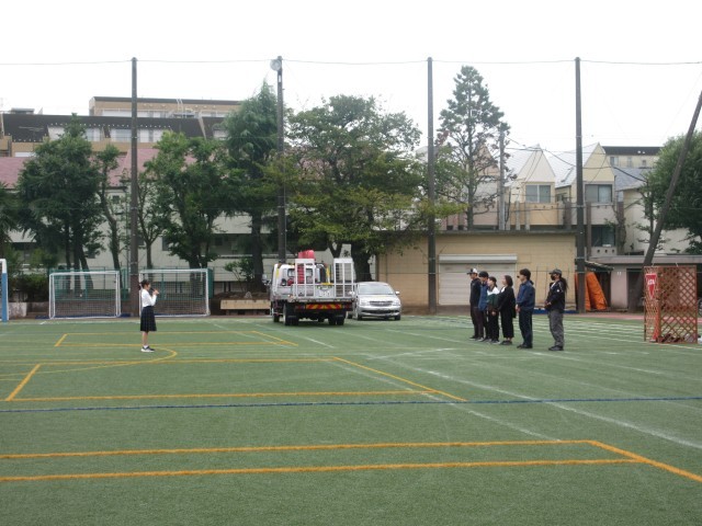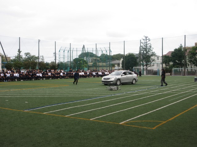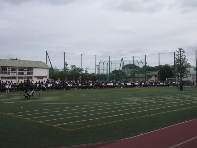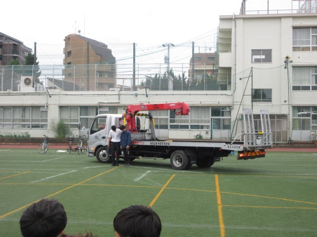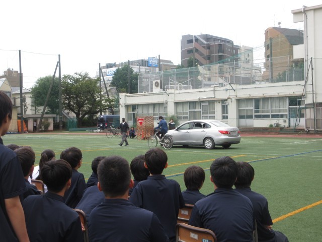今年は、自転車安全教室ということで、オフィスワールドの方々をお招きし、スタントマンによる実演を交えた安全指導をしていただきました。