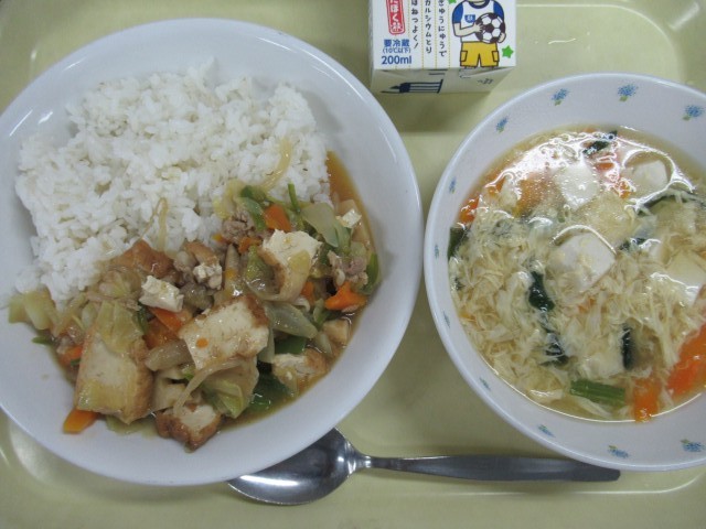 10月16日の給食 公開日 2025/10/16 更新日 2025/10/16 給食 ・ ごはん ・ 家常豆腐・ 卵と豆腐のわかめスープ ・ 牛乳 にんにく(青森) にんじん(北海道) 玉ねぎ(北海道) キャベツ(群馬) しょうが(高知) 鶏肉(宮崎) 卵(栃木) 豚肉(岩手) もやし(栃木) ピーマン(茨城) 小松菜(埼玉)