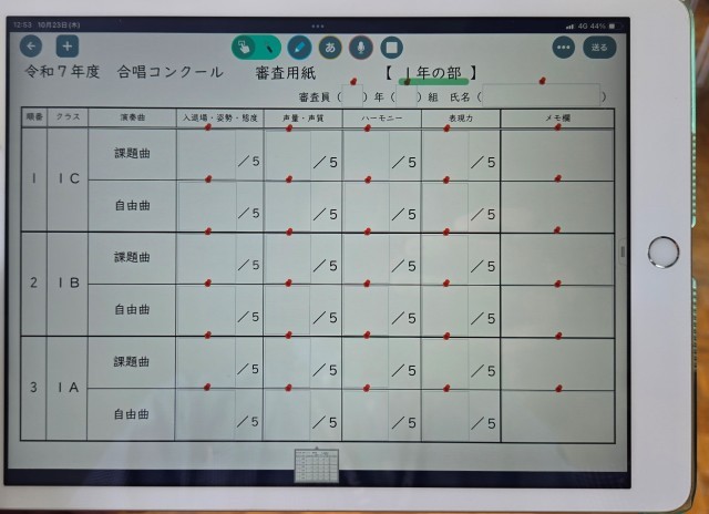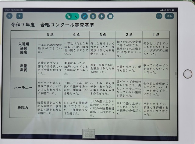 昼休みには、審査員の生徒が集まり、明日の合唱コンクールの審査について最終確認を行っていました。