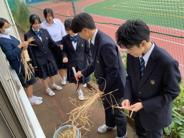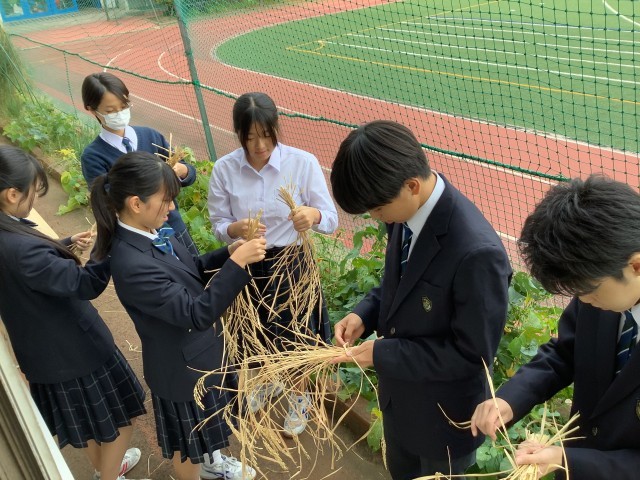 3年生の有志で育てた稲の収穫をしました。鎌で刈り取り、しばらく乾燥させます。バケツでも肥沃な土と水があれば、しっかり育つことがわかりました。