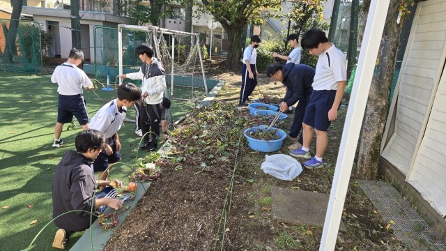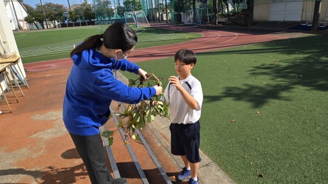 I組の作業の時間に、先日収穫したさつまいものつるを使って、リース作りを行いました。
