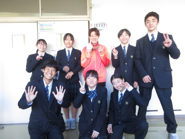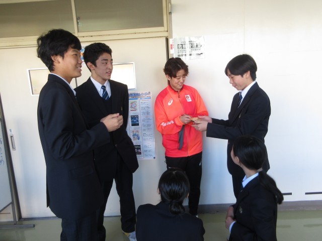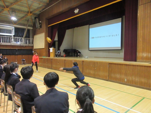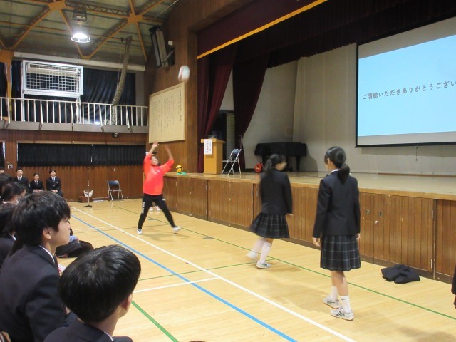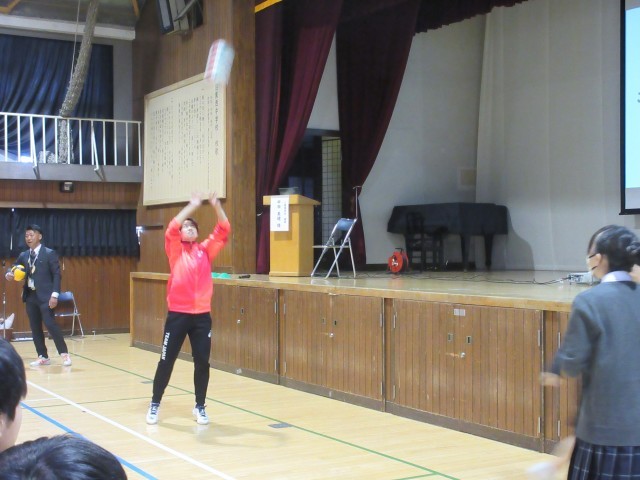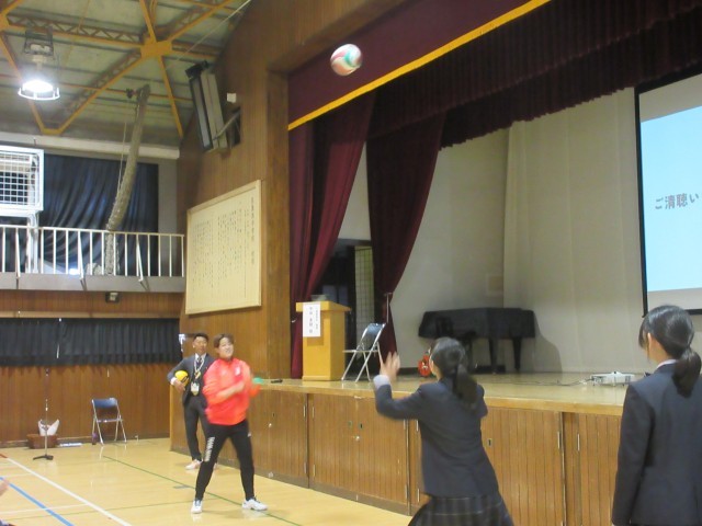 講演会の後半には、本校のバレーボール部の生徒と一緒に、バレーボールのパス練習を披露してくださいました。