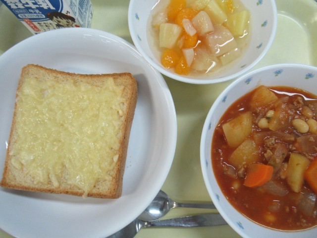 12月15日の給食 公開日 2025/12/15 更新日 2025/12/15 給食 ・ 胚芽チーズトースト ・ チリビーンズスープ・ フルーツポンチ ・ 牛乳 にんじん(千葉) じゃがいも(北海道) パセリ(千葉) 玉ねぎ(北海道) 豚肉(岩手)