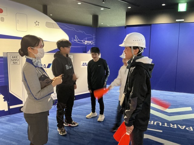 実際に訓練をしているところを見学させていただいたり、客室乗務員や整備士など、空港にかかわるお仕事の内容や難しさについて教えていただいたりしました。
