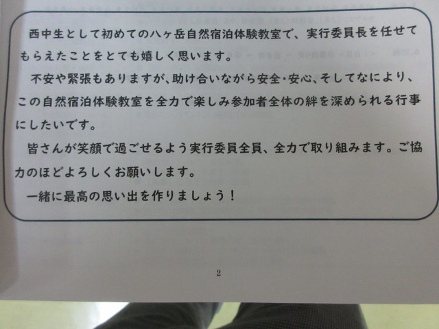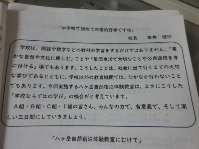 1年生と1I、2Iの生徒は、明日から八ヶ岳自然宿泊体験教室です。
